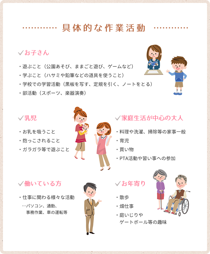 日常生活で行われる「作業活動」は年齢によって様々ですから、「作業療法」で選択される「作業活動」も対象となる方の年齢によって変化します。